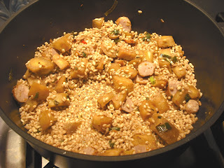 Wash the pearl barley in cold water, a few times (3-4) or until water is clear. Drain thoroughly and add to the eggplant/sausage mix. Fry on medium heat for 2 minutes. Add the bay leaves and wine and stir until the alcohol has evaporated and the liquid has been absorbed on a gentle heat. Add one cup of the stock and stir until the liquid has been absorbed. Repeat the process, adding 1/2 cup of stock until the barley is plump and tender (this should take about 50 minutes). However, just before the last 1/2 cup of liquid, add in the mushrooms. After all the liquid has been absorbed, turn off the heat and add the cream and cheese. Remove the bay leaves.